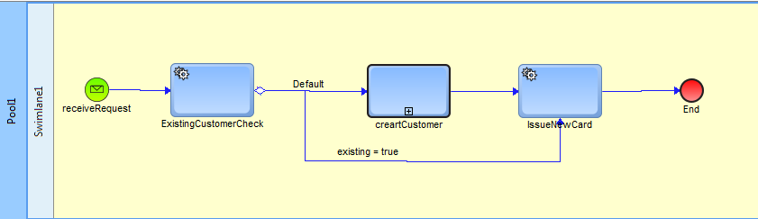 Which is responsible for checking if the customer is an existing customer or not. If it found that it is a new customer the process will call the callable business process ‘CreateCustomer, then it issues the credit card for the customer.