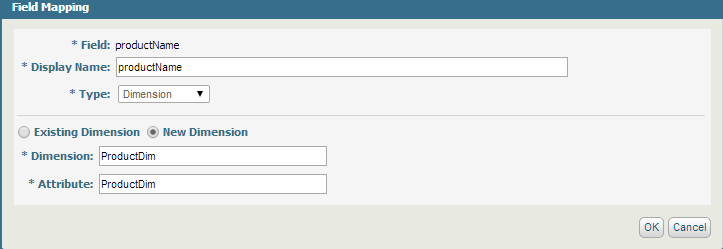 4. Choose the dimension, we will choose the productName dimension (ProductDim). We will explain in more details later.