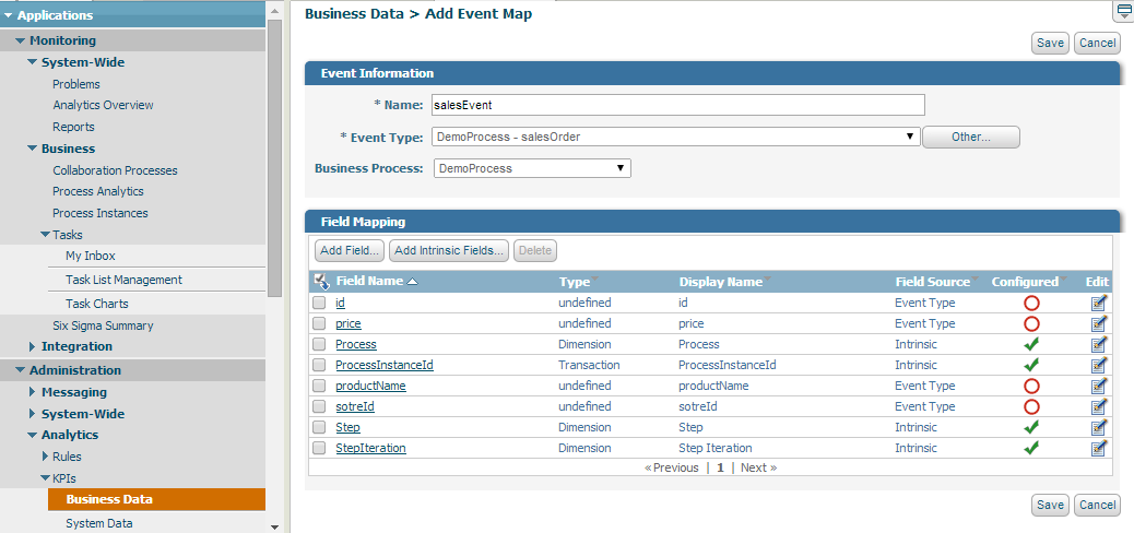 - Click on the event ‘DemoProcess – salesOrder’ under ‘unmapped Event types’.
